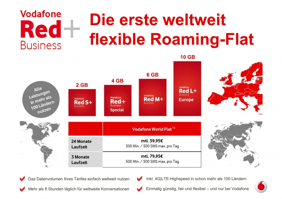 Sowohl mit der Vodafone World Flat als auch mit der Vodafone World Flat Flex profitieren Sie von 500 Freiminuten und 500 frei SMS pro Tag für einen Preis von nur 59,95 € bzw. 79,95 € im Monat.